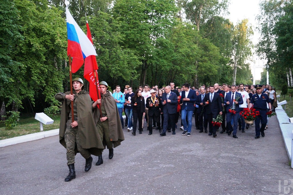 По аллее мемориала колонна участников акции проследовала к Вечному огню. Возглавляли шествие ветеран Великой Отечественной войны Николай Кузьмич Чадаев, вице-губернатор Игорь Греков, руководитель регионального отделения всероссийского общественного движения «Волонтеры Победы» Кристина Зорина, руководитель регионального отделения «Молодой гвардии Единой России» Артем Никитин. Участниками акции стали руководители учреждений, общественных организаций, молодежь, школьники.