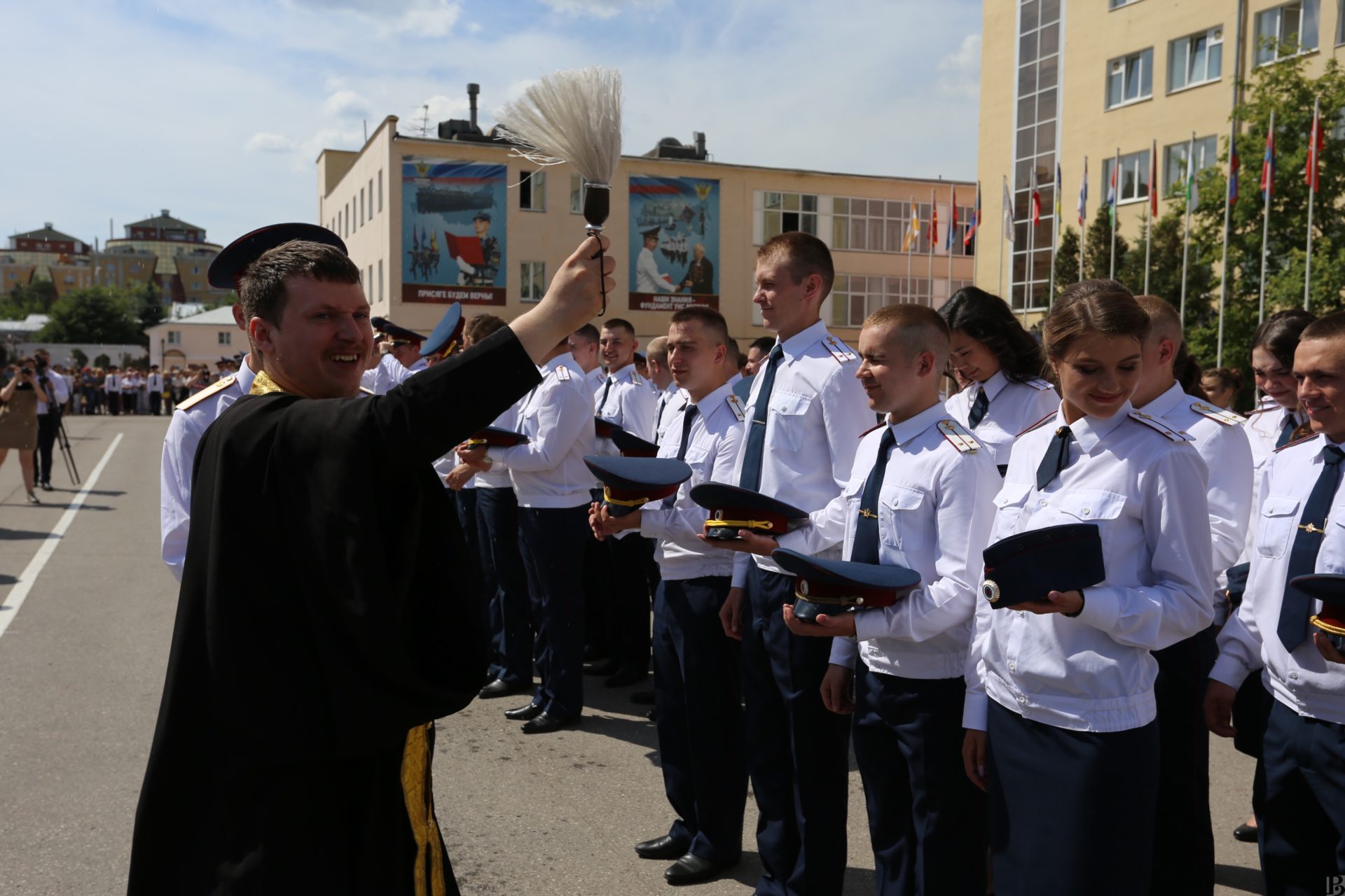 Для них этот день особенный. Молодые лейтенанты в последний раз прошагали строем по плацу, встретили и обняли родных, на счастье запустили в небо голубей и станцевали офицерский вальс. Почетное право поднять Государственный флаг Российской Федерации было предоставлено отличнику учебы, курсанту юридического факультета Никите Артамонову.