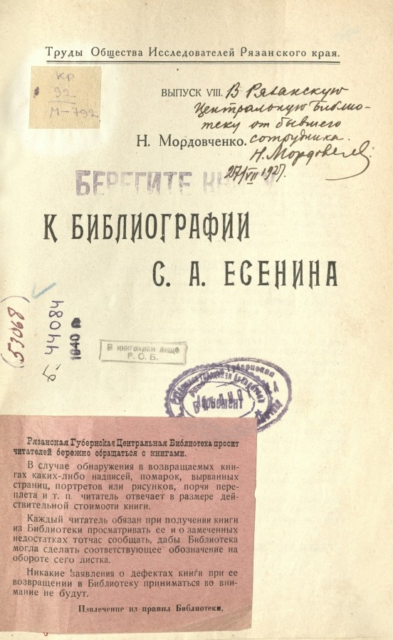 «В Рязанскую центральную библиотеку от бывшего сотрудника. Н. Мордовченко. 27/VII 1927». Эту дарственную надпись оставил на титульном листе своей книги автор уникального справочного издания, которое много лет бережно хранится в краеведческом депозитарии областной библиотеки. Речь идет о библиографическом указателе блестящего российского литературоведа Николая Ивановича Мордовченко (1904 – 1951) – «К библиографии С.А. Есенина», изданном Обществом исследователей рязанского края летом 1927 года в Рязани. Это один из первых аннотированных персональных справочников, где с наибольшей полнотой были учтены публикации о С.А. Есенине, вышедшие в течение первого года после его смерти.