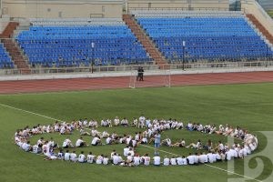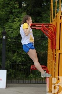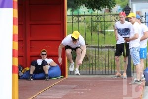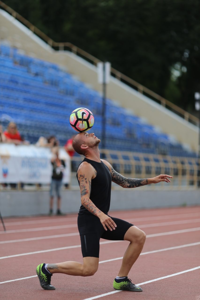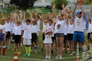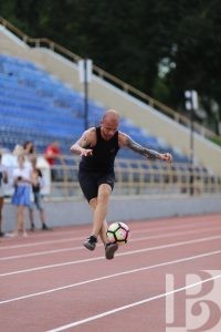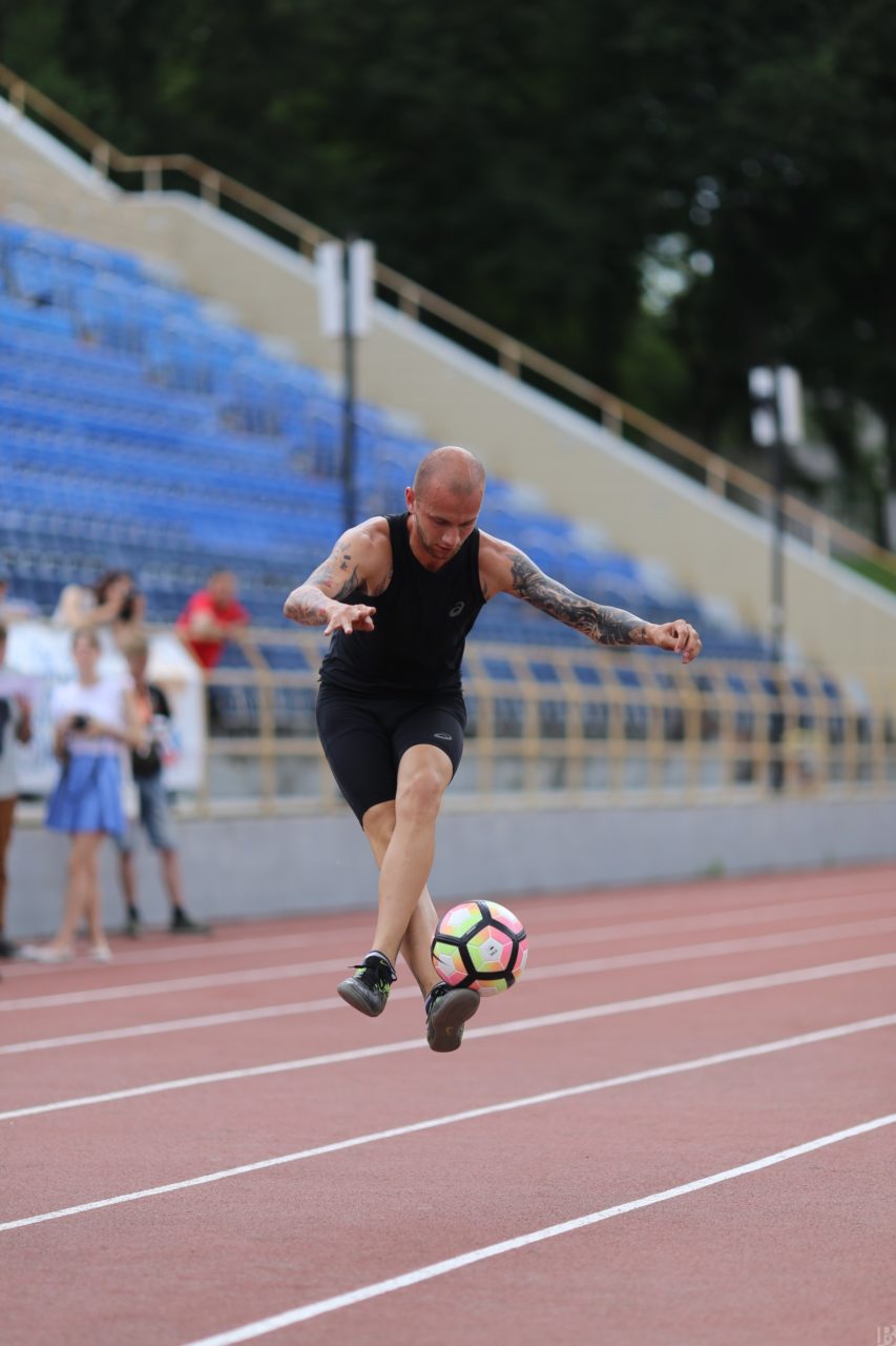 Перед состязаниями на поле стадиона провели зарядку. Упражнения показывали ведущий праздника спорта и волк Забивака, официальный символа чемпионата мира по футболу FIFA. Еще одним сюрпризом для всех стало выступление футбольного фристайлера Руслана Немировского, который продемонстрировал приемы виртуозного владения мячом. А потом спортсмены выполняли различные нормативы, причем среди участников были и дети, и взрослые.