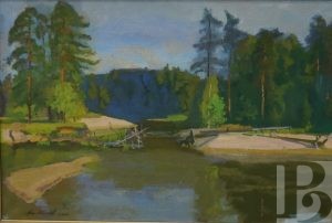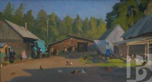 Пейзажи Владимира Александровича очень близки, понятны, наполнены настроением. На одном из них окруженные лесом домик и сараи, во дворе стоит трактор, хозяева наблюдают за тем, как суетятся курочки и петухи – это поселок Лесхим возле Деулина. Но не только родные для рязанцев виды можно увидеть на картинах художника. На одной из работ изображен тяжелый физический труд рыбаков: посреди моря стоят катер и две лодки, между которыми натянута сеть. Это путина салаки в Калининградском заливе.