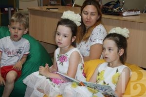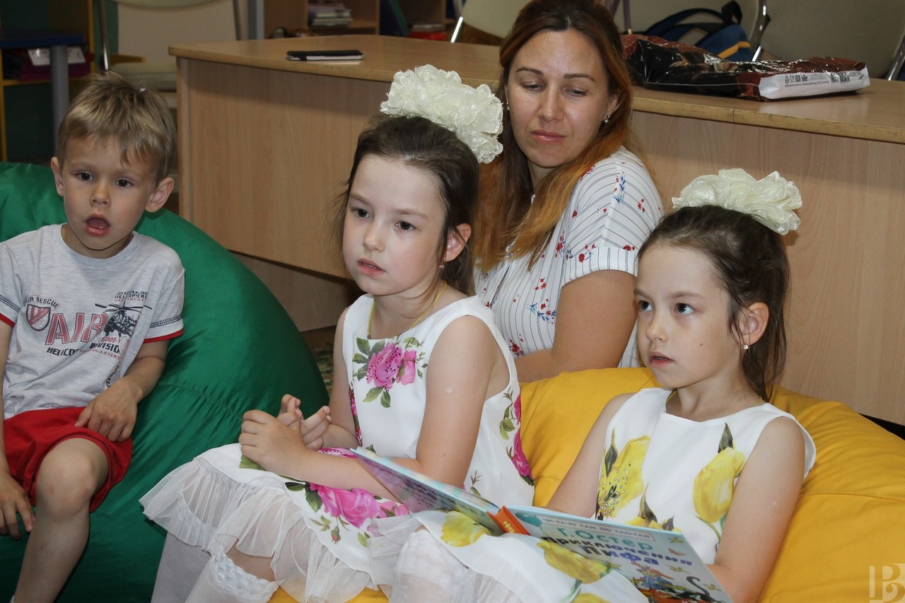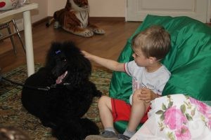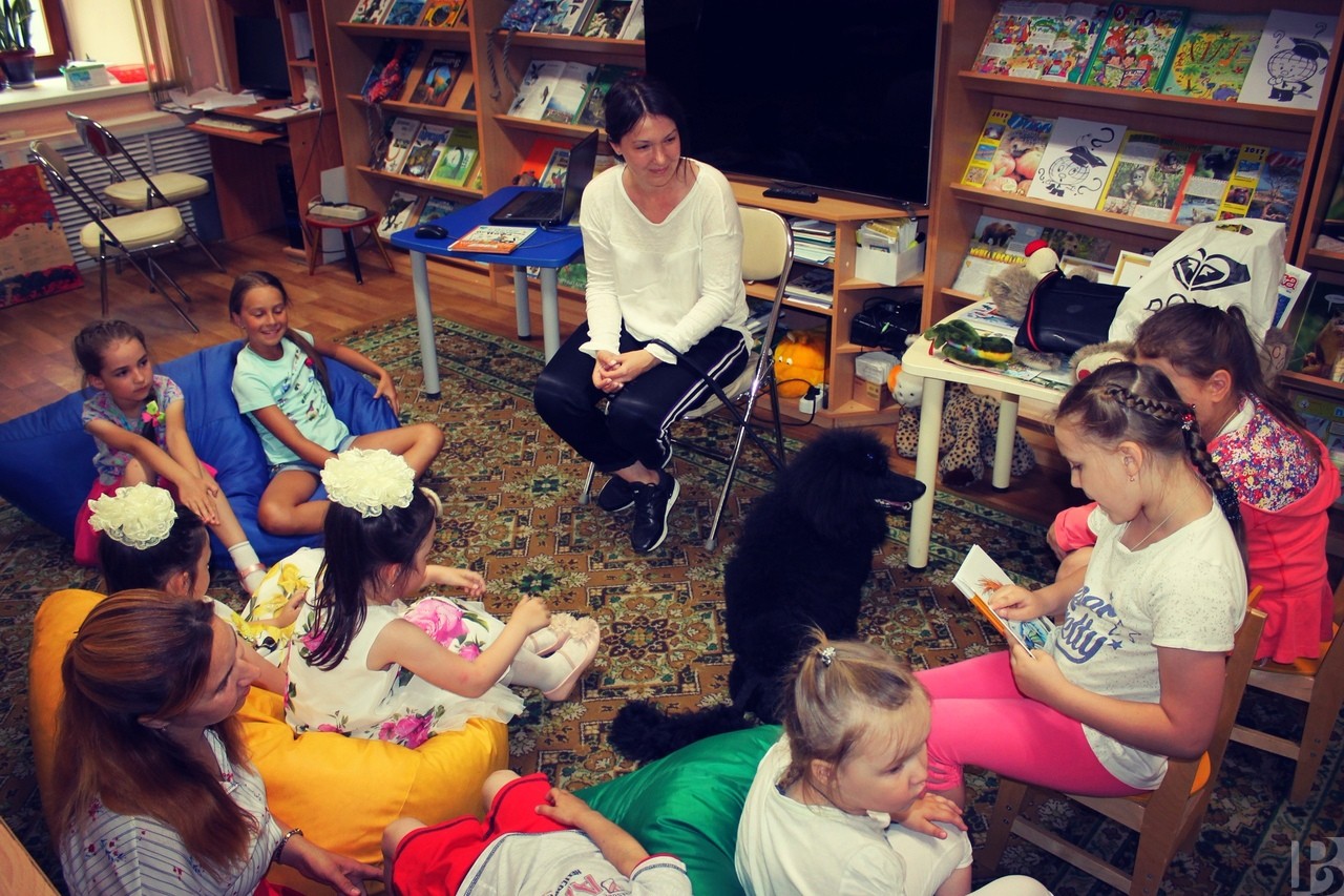Девочки помладше разбирали сказку «Приключения Пифа» того же автора. Наталья предложила им и другим ребятам определить финал сказки по выразительным иллюстрациям. Ну, и разумеется, дети с удовольствием общались с пуделем, пробовали отдавать разнообразные команды, просили щенка «танцевать». А Наталья рассказала, почему порода королевский пудель носит такое название и в чем особенности этих красивых и необычных собак.