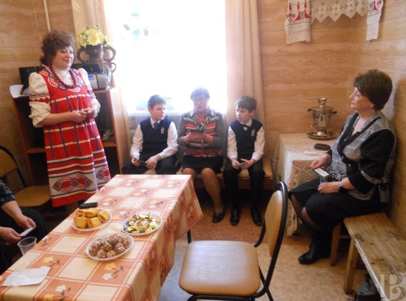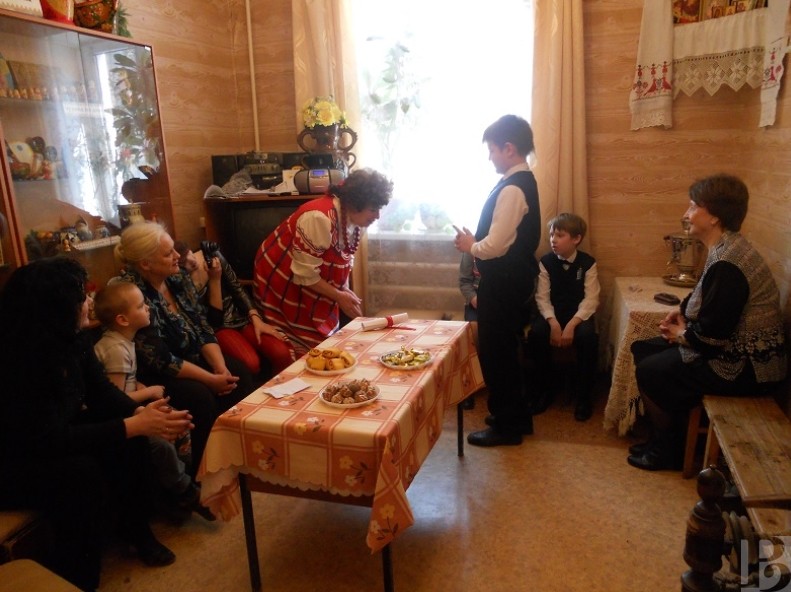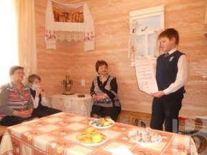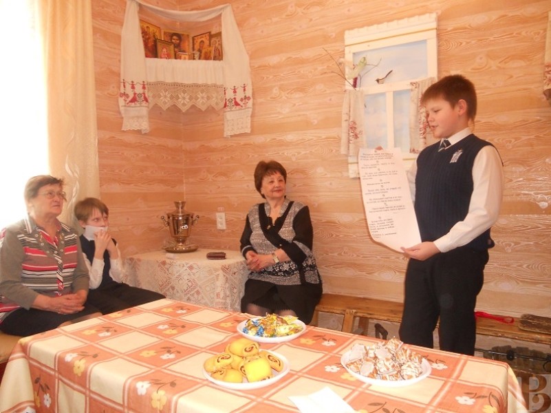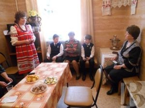 Для застолья выбиралось самое красивое, просторное помещение, полы устилали коврами, лавки – расшитыми половиками, а столы – нарядными скатертями. Школьникам рассказали, что стол делился на постный и скоромный, причём так было и у царя, и у простолюдина.