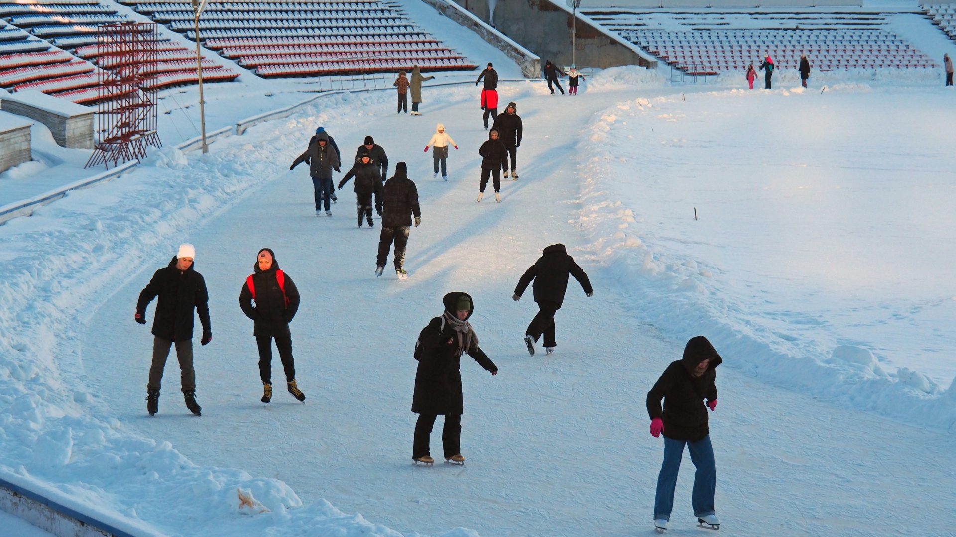 На стадионе Центрального спортивного комплекса открылся каток. 400 метров ровной ледовой дорожки, музыка, кофе, прокат и заточка коньков – прекрасное место для активного отдыха, общения и знакомств. Фото Димитрия Соколова
