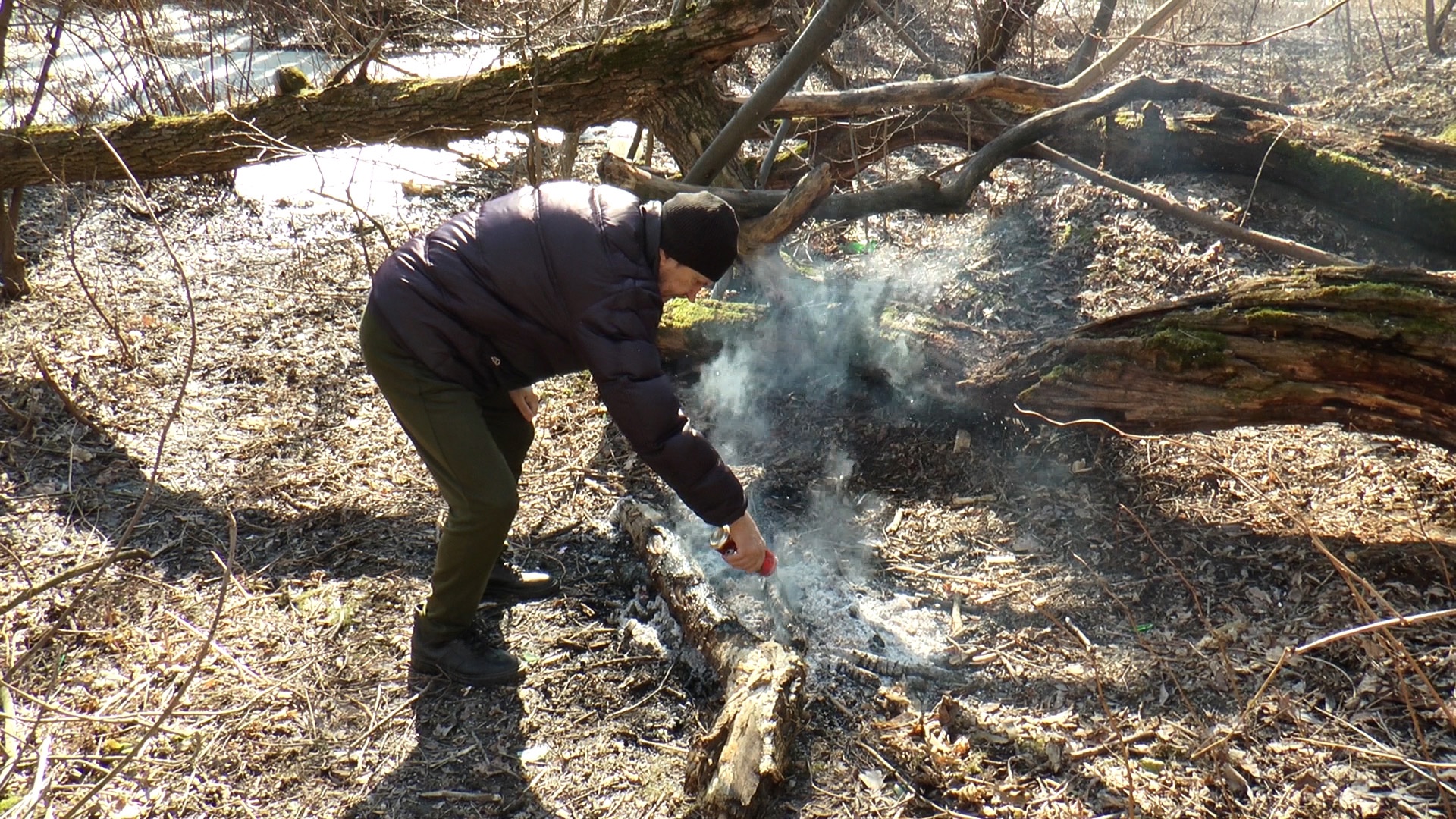 Рюмина роща. Краевед Игорь Канаев обнаружил на берегу ручья непотушенный костер и решил обезопасить ЦПКиО от распространения огня, потушил костер подручными средствами. В выходные огнеборцы ликвидировали восемь возгораний сухой травы в области. Фото Димитрия Соколова