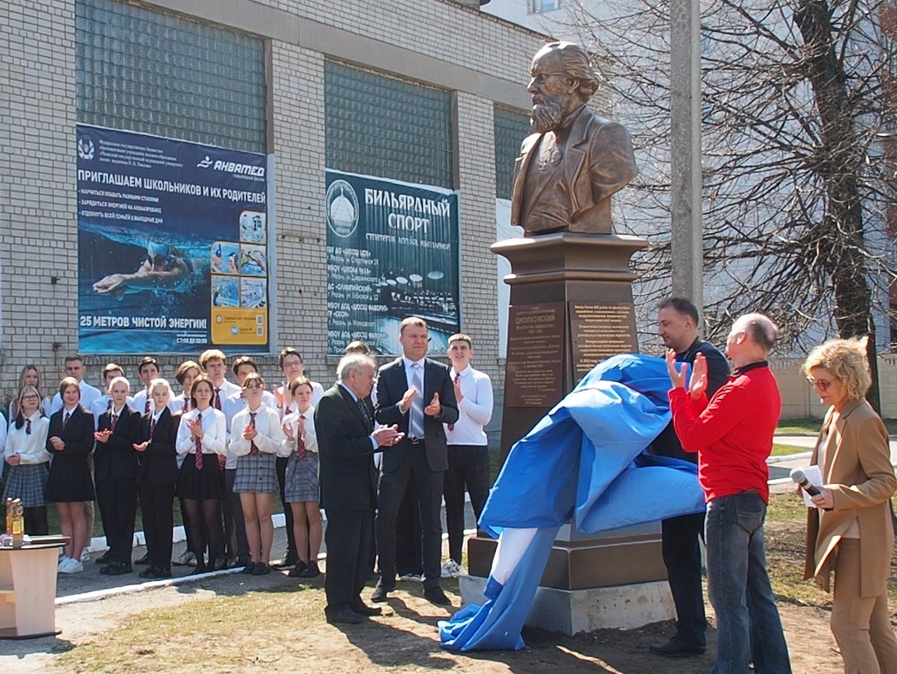 День космонавтики. Во дворе школы №16 открыли бюст провозвестнику космической эры Константину Эдуардовичу Циолковскому. Памятник установлен в рамках проекта «Аллея российской славы». В школе более 40 лет действует музей космонавтики имени К.Э.Циолковского. Фото Димитрия Соколова