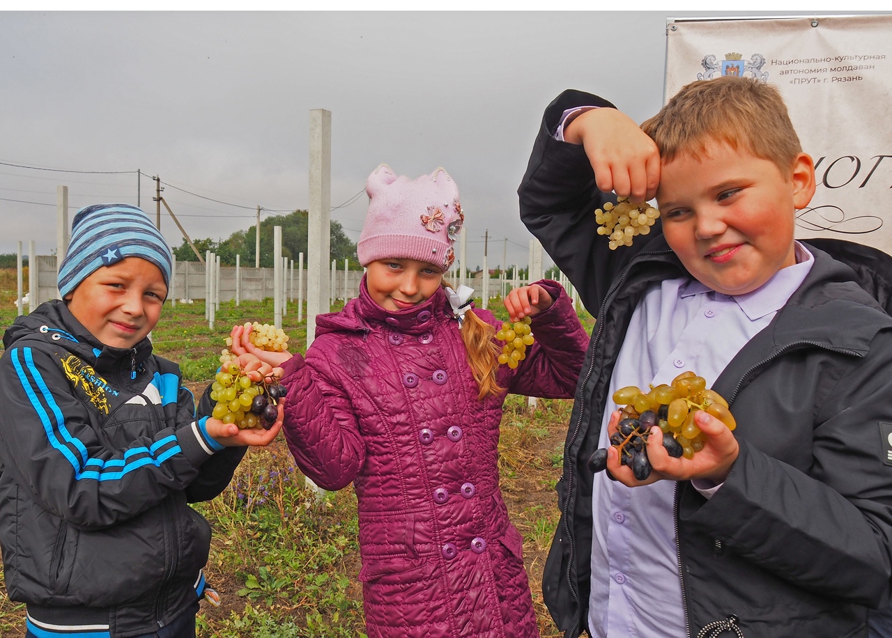 Сбор винограда в Рязанском районе. В гости к семье фермеров приехали школьники из Льгово, Кораблино и Вышгорода. Глава хозяйства Виорел Крецу угостил их спелыми гроздьями винограда нескольких сортов. Ягода нынешнего урожая сладкая, на прилавках не всегда такую найдешь. Фото Димитрия Соколова