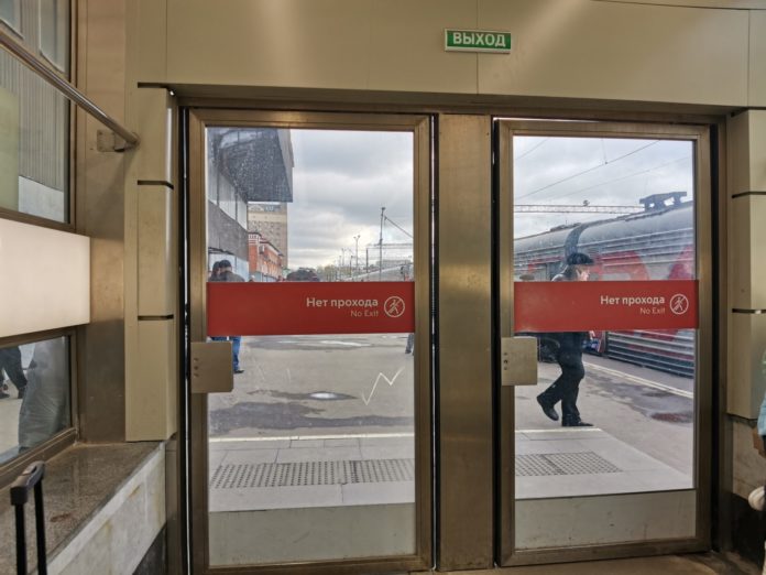 Москва, Казанский вокзал. Вот и разбери – есть выход или нет. На дверях надпись «Нет прохода», а сверху крупными буквами «Выход». А ведь так у нас чуть ли не во всем: на каждый разрешающий документ есть запрещающий. И наоборот. Полная свобода импровизаций. Я и думать не стал: толкнул дверь, и вот он, поезд до Рязани. Фото Димитрия Соколова
