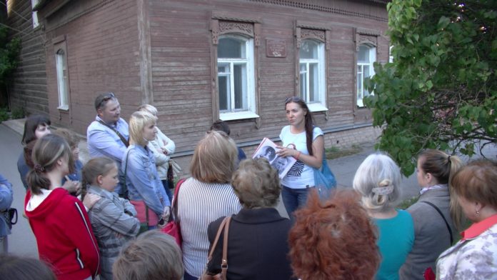 Всемирный день экскурсовода. На снимке: автор проекта “Я вам покажу” Ксения Паначева рассказывает экскурсантам о доме, где бывали К.Паустовский, А.Гайдар и Р.Фраерман. Фото Димитрия Соколова