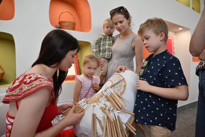 Студенты Высшей школы народных искусств проводят мастер-класс по плетению на коклюшках в «Резиденции традиций». Фото Димитрия Соколова