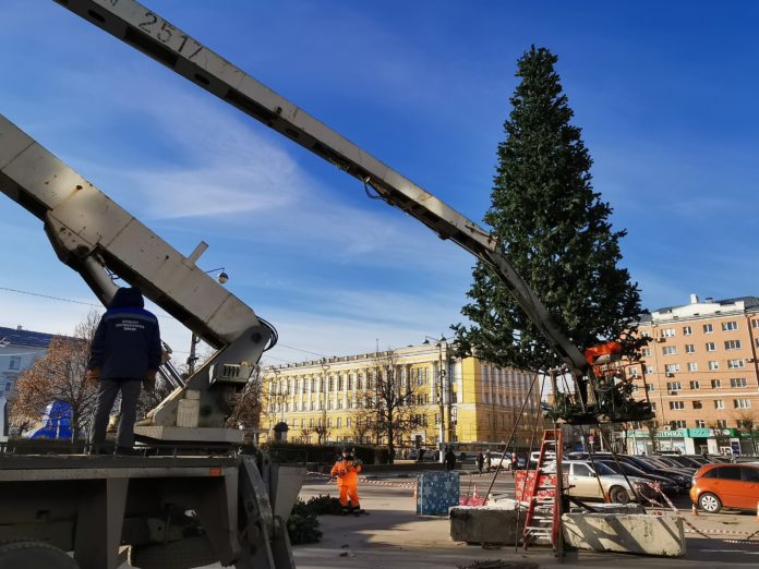 Добрались до Театральной. На площади возле театра установили новогоднюю красавицу высотой 12 метров – одну из 35 праздничных елок города. Фото Димитрия Соколова