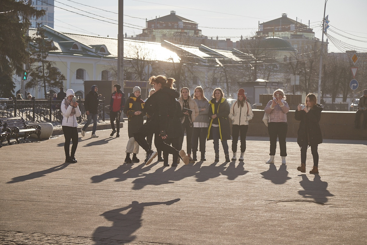 Весна пришла! Шкала на градуснике стремится вверх вместе с настроением. А за памятником Ленина школьники устраивают танцевальные батлы. Фото Дмитрия Осинина.