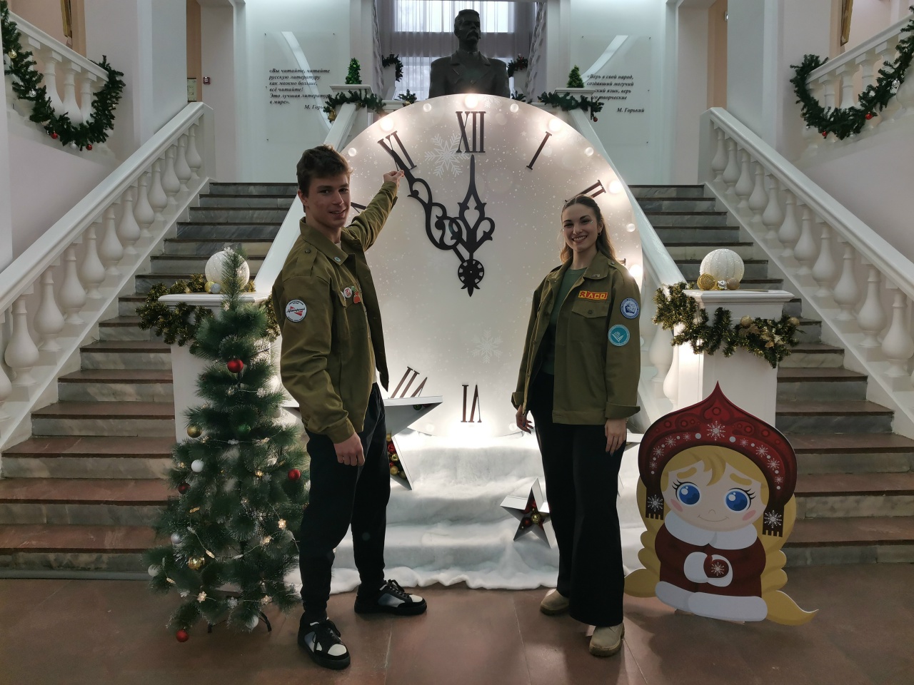 На фоне уходящего года. В учреждениях культуры области появились уютные фотозоны. На снимке: стройотрядовцы РГУ Игорь Фофанов и Мария Худинова. Фото Димитрия Соколова
