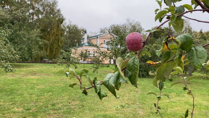 В Рязанской области продолжается сбор яблок. В этом году урожайность плодовых деревьев ниже прошлого года из-за холодного мая и засушливой второй половины лета. На снимке: хорошие яблоки уродились на усадьбе Лидии Кашиной музея-заповедника С.А.Есенина.