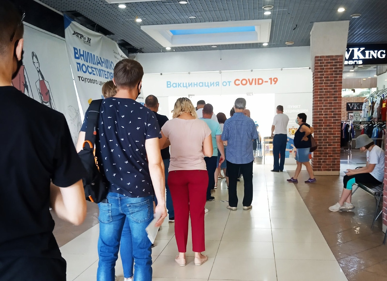 Продолжается прививочная кампания против коронавируса. На фоне подъема заболеваемости растет и спрос на вакцинацию. К прививочному пункту в ТЦ “Атрон” выстроилась очередь из желающих защитить себя от опасной инфекции. Люди собрались еще до открытия пункта. В 10 утра в очереди было уже около двух десятков человек. Фото Людмилы Ивановой