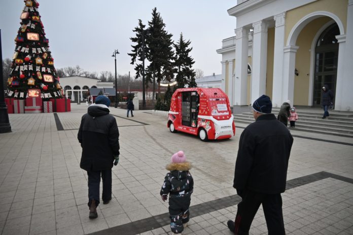 Беспилотный автомобиль ездит по Рязанской ВДНХ и предлагает прохожим напитки. «Пряник-мобиль» создан компанией «Аврора Роботикс» и демонстрирует возможности новых технических решений в области сервиса и – в перспективе – городского транспорта. Фото Димитрия Соколова