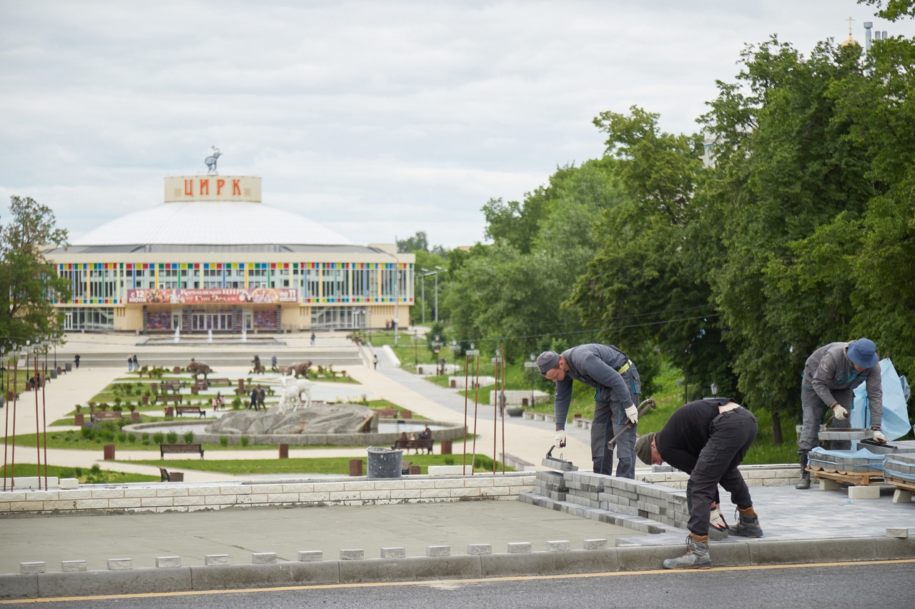 Продолжаются работы по благоустройству пешеходной части Астраханского моста в Рязани. Торжественное открытие моста со сквозным проходом, соединяющим обе части Лыбедского бульвара, намечено в День города, 31 июля. Фото Дмитрия Осинина