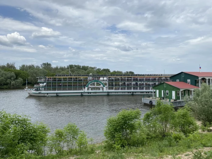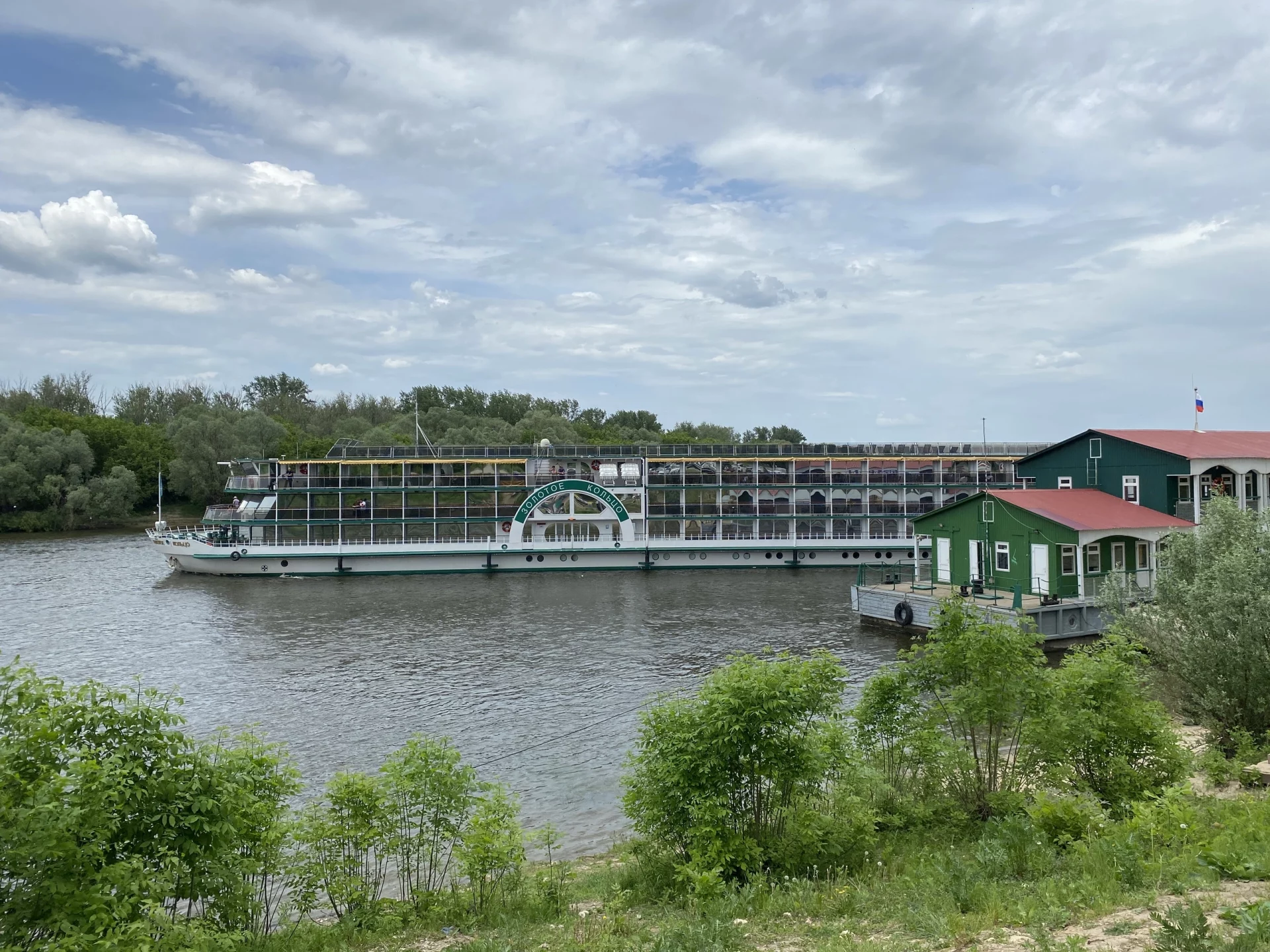 Трехпалубный теплоход «Золотое кольцо», следующий из Нижнего Новгорода в Москву, отчаливает от рязанской пристани. Фото Димитрия Соколова