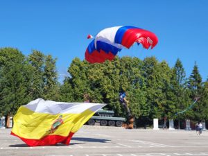 Многие прославленные парашютисты пришли на торжества и, запрокинув голову вверх, наблюдали за своими молодыми коллегами, которые совершали прыжки с флагами России, ВДВ, Рязанской области и Рязани прямо на плац.