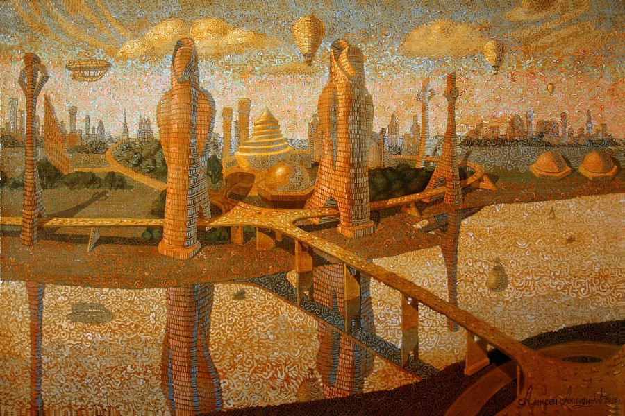 «Все пространство, то, что в моей реальности занимали поля, расположенные по ту сторону Оки, все оно застроено. Там мосты и дома, подобные горбам верблюдов и гигантским краюхам хлеба».
