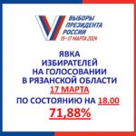 Как сообщает рязанский Облизбирком, явка на президентских выборах по состоянию на 18.00 17 марта 2024 года в Рязанской области составила 71,88%.