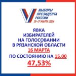 Как сообщает региональный избирком, явка на президентских выборах по состоянию на 15.00 16 марта в Рязанской области — 47,53%.