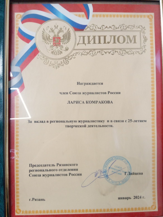 Журналистика требует времени, душевных сил и горения, интереса ко всему происходящему вокруг, неравнодушия. А ещё легкости на подъём, готовности ехать в неближний свет «ради нескольких строчек в газете», умения быть беспристрастным в анализе ситуации или проблемы, хорошего знания русского языка, умения общаться с людьми. Не все выдерживают подолгу в этой профессии. Но оставшиеся – настоящие профессионалы. Об этом говорила, поздравляя Ларису Комракову (сегодня она заместитель главного редактора «Областной рязанской газеты»), председатель регионального отделения Союза журналистов России Галина Зайцева. Она вручила виновнице торжества диплом «За вклад в региональную журналистику и в связи с 25-летием творческой деятельности».
