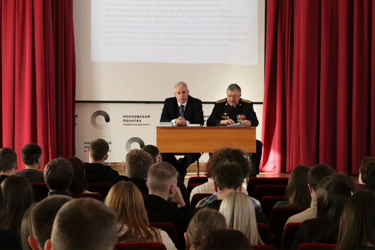 Полковник запаса ФСБ Валерий Савин и подполковник запаса ФСБ Сергей Рюмин провели Урок мужества у студентов первого курса Рязанского института Московского политехнического университета.