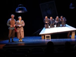 Музыкальное вступление быстро погружает тебя в атмосферу ожидания чего-то необычайно тревожного. Оно буквально зависает в воздухе, и когда ты видишь городских чиновников, усевшихся за одним большим столом, весьма причудливым, покрытым зелёным сукном, то уже предчувствуешь: вот-вот произойдёт что-то из ряда вон выходящее. Замечу, что музыка спектакля – больше, чем оформление. Она – самостоятельный герой. Произведения Альфреда Шнитке и Владимира Устинова ещё долго звучат в голове после того, как опустится занавес.