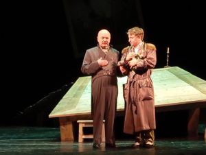 Городничий Антон Антонович Сквозник-Дмухановский (в этой роли блистает почётный работник культуры и искусства Рязанской области Владимир Баранов) пуще всего боится «инкогнито проклятое». Чиновник из Петербурга Хлестаков до дрожи в коленках боится, что за неуплату долгов в гостинице его упекут в тюрьму. В первой встрече этих двух героев (сцена разыграна по всем канонам классической комедии положений) главным персонажем оказывается страх. Это он лишает городничего, «очень неглупого по-своему человека», житейского опыта во взгляде на Хлестакова. Неслучайно с горечью потом признаётся в том Антон Антонович: «Сосульку, тряпку принял за важного человека!.. Вот, подлинно, если Бог хочет наказать, так отнимет прежде разум. Ну что было в этом вертопрахе похожего на ревизора? Ничего не было! Вот просто ни на полмизинца не было похожего».
