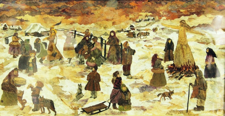 На окраине села стынет ненастный осенний вечер, укутывая дома, поля и рощи в плотные облака. Люди расходятся по домам, негромко обсуждая радости и неурядицы, как вдруг с неба раздаются голоса. Дед с бабкой приникают к плетню, внучек забирается по бревнам сарая, чтобы лучше рассмотреть удивительную картину, дворовый пес замирает на пригорке… Все глядят, кто с грустью, кто с надеждой, на журавлиный клин, улетающий за горизонт, и даже солнце чуть-чуть выглядывает из-за туч, чтобы полюбоваться птицами и осветить им путь. Панно иллюстрирует стихотворение «Отговорила роща золотая» С.А. Есенина. Примечательнее всего то, что природа не только стала образом для художницы Елены Захаркиной, но и подарила материалы. Деревья, холмы, небеса, люди – все мастерски выложено из фрагментов засушенных листьев, лепестков и трав. Так что роща, может быть, и отговорила – но теперь ее голос сохранен на картине в приятных оттенках осени.