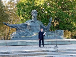 Он проходит в эти минуты на набережной, у памятника поэту.