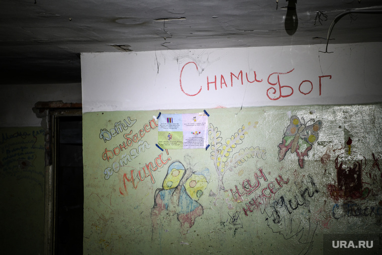 Одна из болевых точек Донецка — район шахты имени Челюскинцев. Некогда отдельный шахтерский поселок теперь относится к Петровскому району Донецка. Обстрелы здесь не прекращались последние восемь лет, но пик бомбежек пришелся именно на 2014—2016 годы. Тогда жители близлежащих к шахте домов были вынуждены месяцами жить в подвалах бомбоубежища. Порой в подвалах шахты пряталось до двухсот человек, большая часть из которых были дети. В 2014 году в убежище побывала донецкий фотограф Ирина Лашкевич, сделавшая серию пронзительных фотографий. Уже в 2022 году украинские хакеры взломали аккаунт фотографа, украли изображения детей и представили их за юных харьковчан, якобы прятавшихся в бомбоубежищах этой весной. Корреспонденты URA.RU отправились на шахту имени Челюскинцев и своими глазами увидели детские рисунки, зафиксированные Лашкевич.