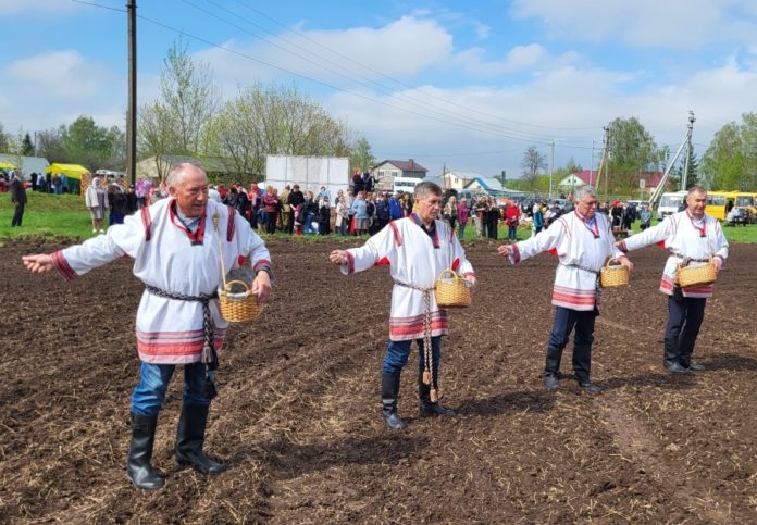 Символическую борозду вспахали на лошади, а потом стали готовиться к севу. Зерно и земледельцев батюшка окропил святой водой. Облачённые в косоворотки сеятели вышли в поле.