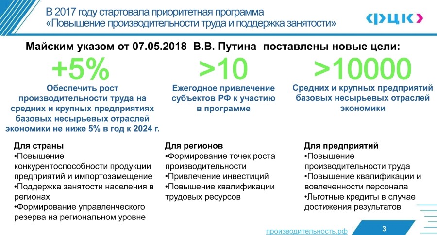 На стартовом совещании в Рязани губернатор Николай Любимов напомнил, что в мае 2018 года подписан Указ Президента России о национальных целях и стратегических задачах развития нашей страны на период до 2024 года. В число двенадцати национальных проектов включено направление «Производительность труда и поддержка занятости». 24 сентября 2018 года президиумом Совета при Президенте РФ по стратегическому развитию утвержден паспорт этого нацпроекта.