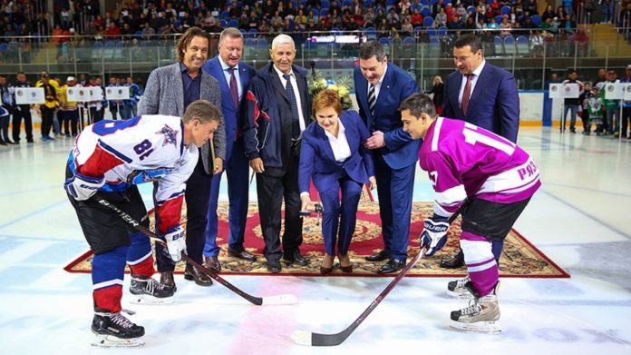 Было немало напутственных слов, не забыли и ветеранов рязанского хоккея. В день открытия в Рязани сезона НХЛ исполнилось 74 года главному судье соревнований Сергею Сергеевичу Козыреву. Он и был приглашен для участия в символическом вбрасывании шайбы.