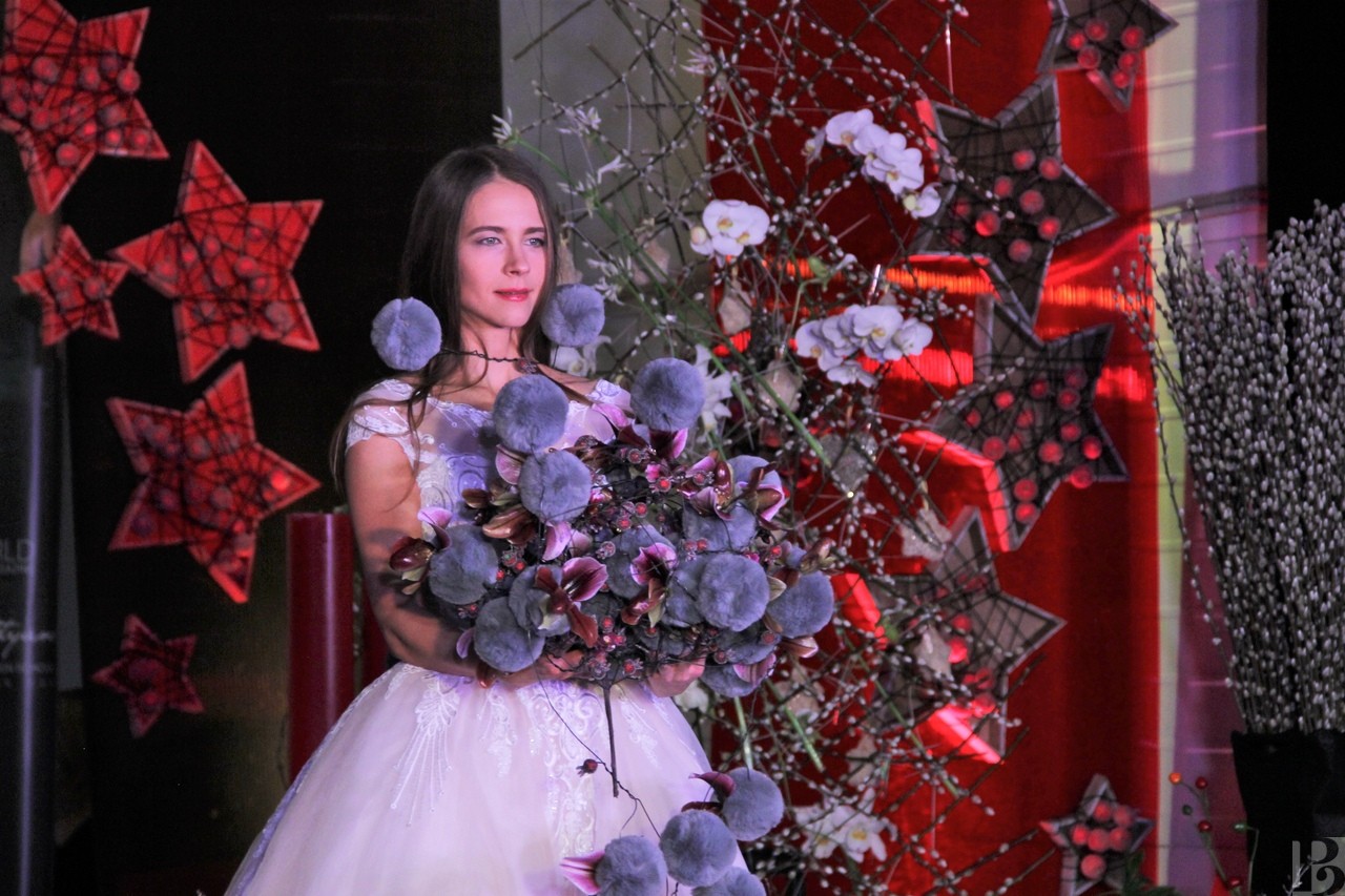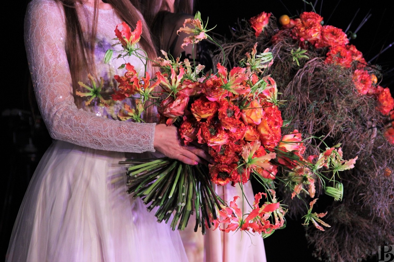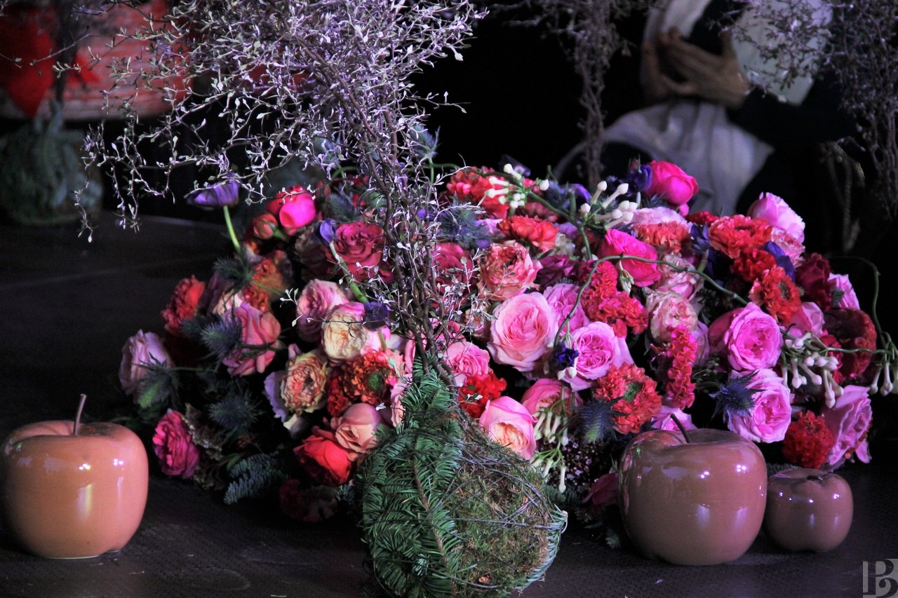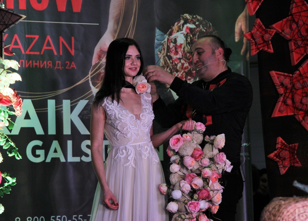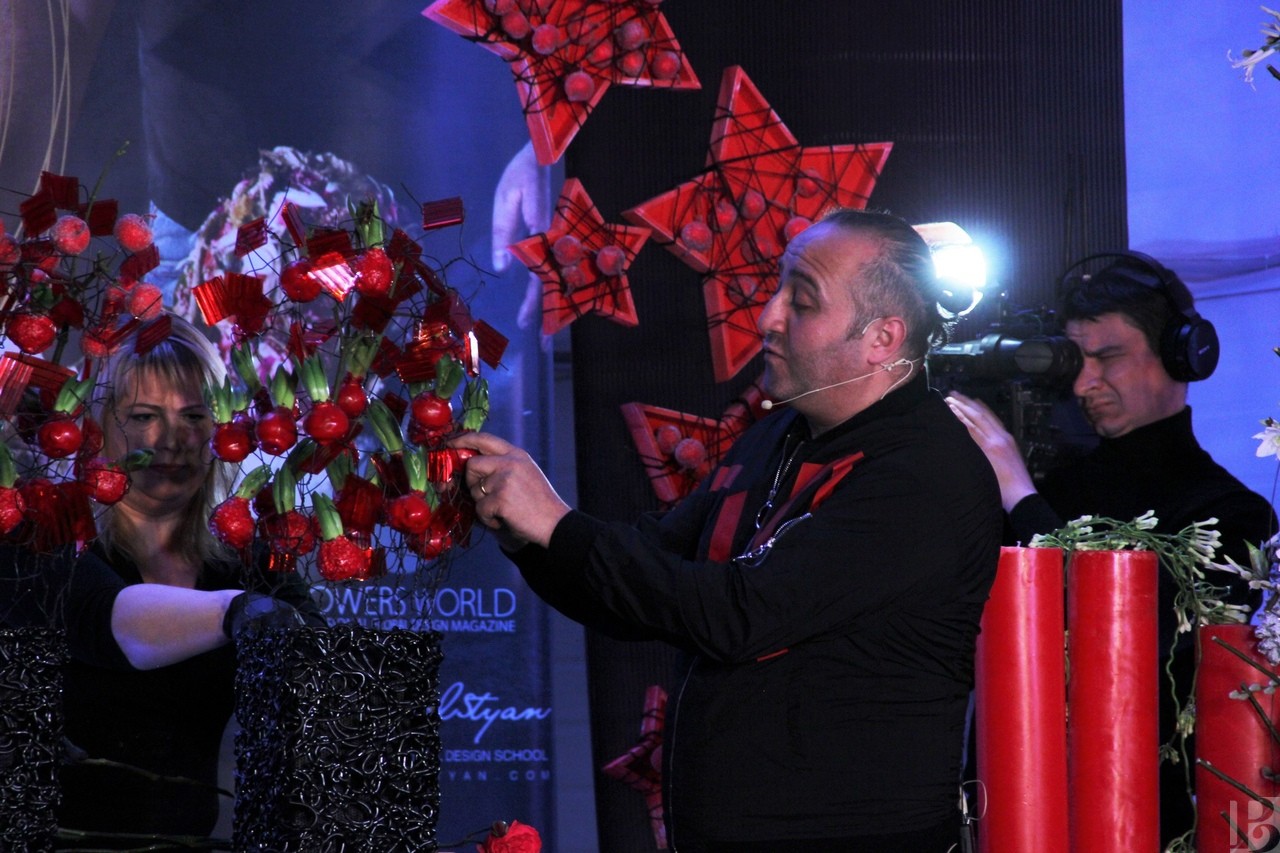 Отличительные черты творчества Галстяна – многослойность композиций, богатство цветовой палитры, использование экзотических растений и нетривиального декора. Например, свадебные букеты украшались гроздьями ягод или меховыми помпонами. В интерьерных букетах предлагалось задействовать пластик, бумагу, проволоку и необычные кашпо. Флористы заставили своими творениями всю сцену, а букеты невест демонстрировали модели в свадебных нарядах. Встреча продолжилась фуршетом и общением.