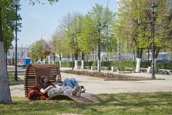 Молодежь встречает весеннее тепло в креслах для отдыха, установленных в сквере на улице Краснорядской в Рязани. Фото Дмитрия Осинина