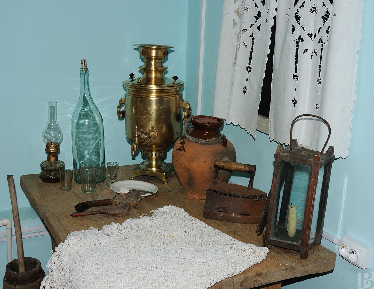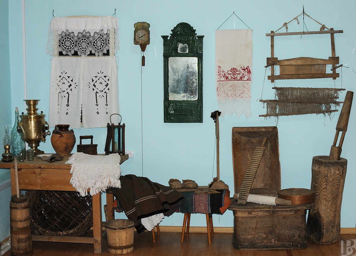 Кроме авторских фотографий представлены предметы крестьянского быта. Это экспонаты из краеведческого музея Городковической волости, открытого Сергеем Викторовичем в селе Орехово. В трёх основных экспозициях этого музея представлен крестьянский быт конца IX – начала XX вв., традиционные ремёсла наших предков, жизнь села в советские годы. В музее можно увидеть деревянную мебель и глиняную посуду ручной работы, различные предметы бондарного промысла прошлого и позапрошлого веков. Интересна коллекция инструментов, которыми пользовались наши предки: старинные пилы, рубанки, коловороты и многие-многие другие. Представлено и самобытное местное рукоделие: разнообразные подзоры, салфетки, накидки и скатерти. Экспозиция советского периода позволяет окунуться в недавнее прошлое села Орехово.