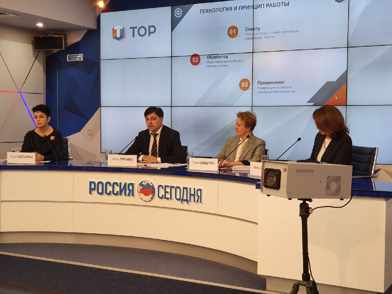 АРС-ПРЕСС (альянс руководителей региональных СМИ) пригласил на пресс-конференцию в РИА “Новости” главных редакторов изданий. О том, что велись разработки прибора, информация в Интернете уже есть. Специалисты концерна ГРАНИТ подчеркнули – бюджетные средства для реализации проекта не привлекались. Поводом для пресс-конференции послужило то, что высокотехнологичный прибор «ТОР» получил паспорт медицинского изделия. Документ, выданный Росздравнадзором, подтверждает эффективность аппарата «ТОР» в борьбе с COVID-19 и безопасность использования для человека.