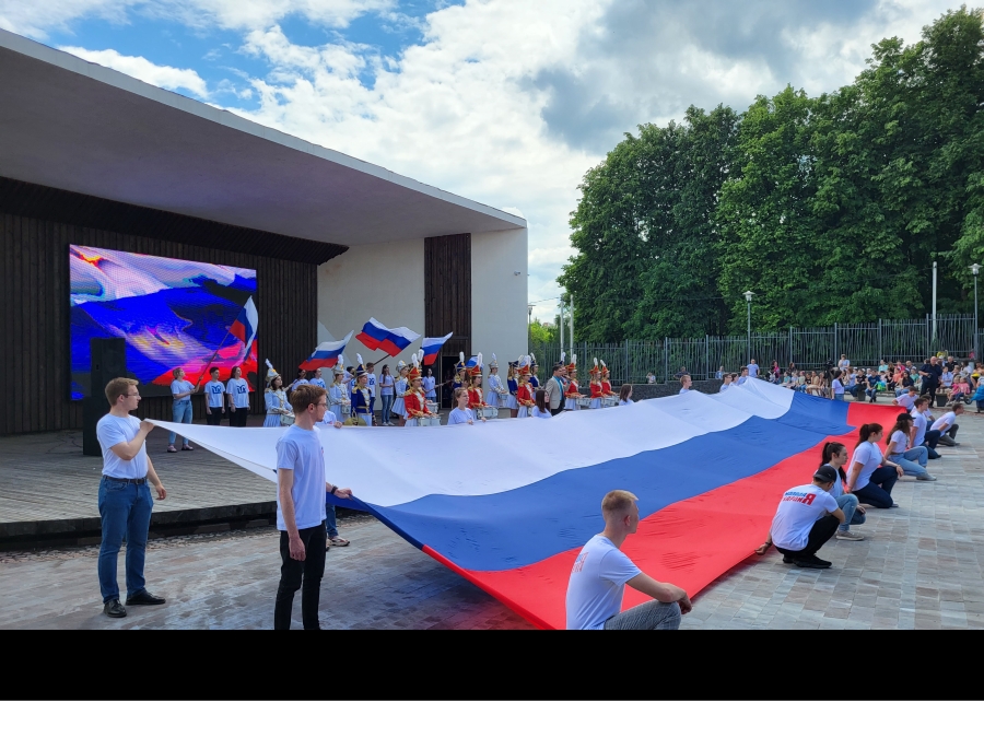 Полотнище размером 26х3,5 метра рязанцы вынесли к сцене Зеленого театра, и все вместе исполнили Гимн Российской Федерации, открыв торжества в честь главного праздника страны.