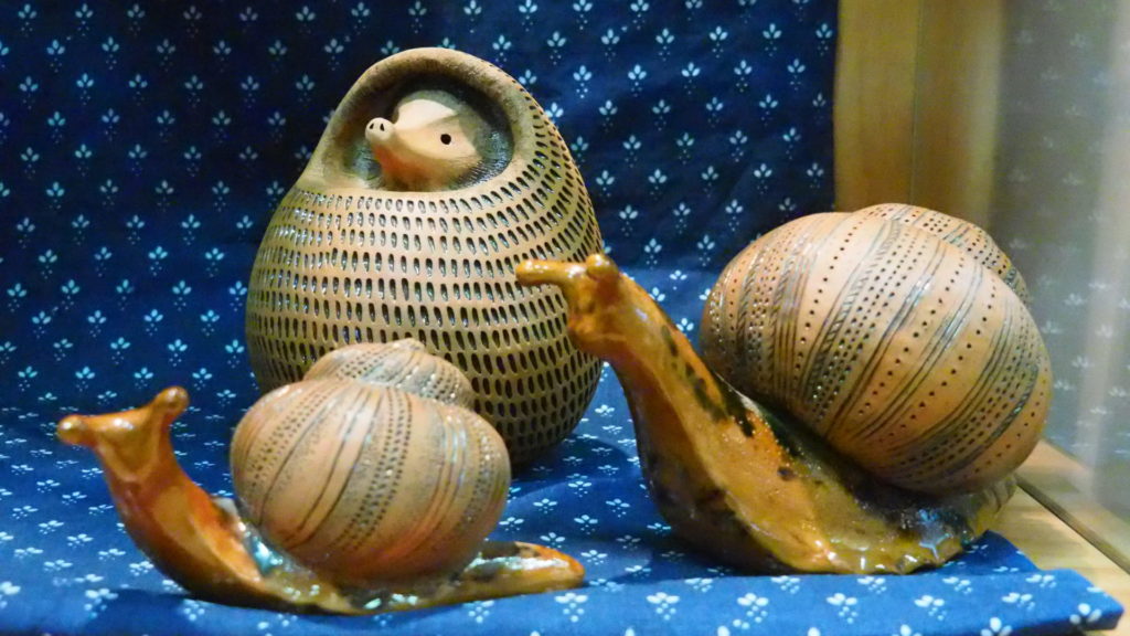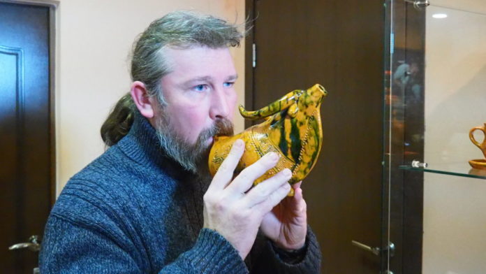 На отдельной витрине – реплики изделий, созданные по старинным археологическим образцам, отсылающим нас в древнюю Византию или скандинавские земли. Курительные трубки из красной глины будут интересны коллекционерам и любителям хорошего табака. Необычны и свистульки, выполненные, как и прочие изделия, с применением техник свинцовой поливы, обвара, лощения. Это не крошечные игрушки с тоненькими голосами, а достаточно габаритные изделия с пышными формами, поющие низкими и приятными, переливчатыми голосами: броненосец, ёж, улитка…