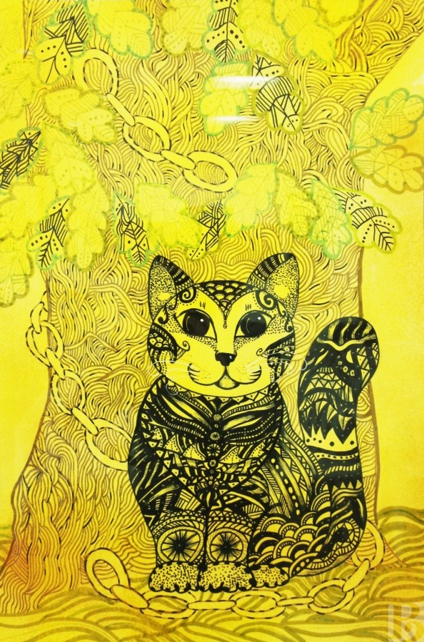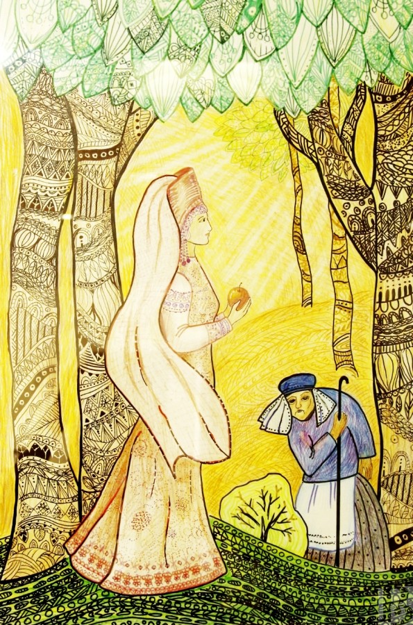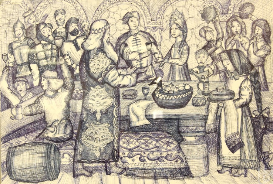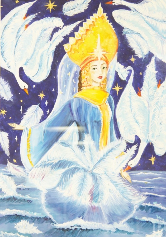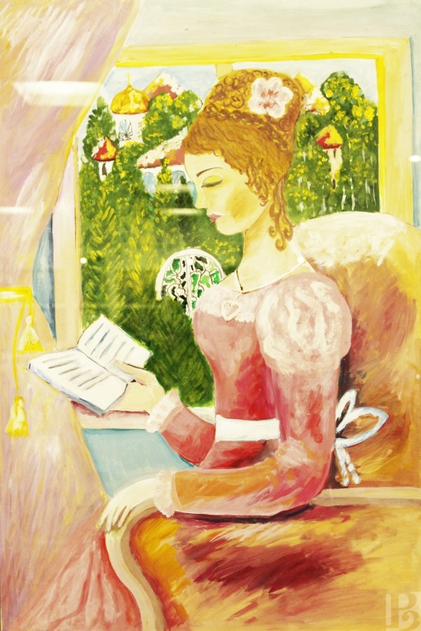 Всего в экспозиции 40 работ юных донецких художников. Дополняют их книги из фондов областной библиотеки, посвященные жизни и творчеству А.С. Пушкина, а также разнообразные предметы старины. Посетитель может вчитаться в бессмертные строки и увидеть, как их интерпретируют современные дети. Милана Шабанова из Донецка изобразила могучий ветер из «Сказки о мертвой царевне и семи богатырях» черноволосым мужчиной, который словно вырастает над горами. В этом лике есть что-то врубелевское и дикое, но доброе. Вот графическая версия свадебного пира из «Сказки о царе Салтане». Ее создала Виктория Козлова из села Павловка Марьинского района Донецкой области, и это настоящая галерея образов: счастливый царь-отец, веселый мальчишка-музыкант, богатыри с кубками и молодая пара с сияющими глазами… А количество версий знаменитого Лукоморья на выставке не сосчитать!