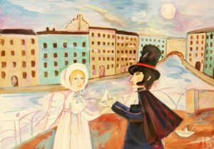 Выставка «Я памятник себе…» работает в областной библиотеке имени Горького. В прошлом году «Арт-Донбасс» представлял здесь серию «Капля жизни», посвященную произведениям И.С. Тургенева. И тогда, и сейчас зрителей поражает качество работ: даже семилетние дети уверенно владеют сложными техниками и хорошо чувствуют пространство. Вот ученица художественной школы Горловки Полина Свириденко изображает собственное видение хрестоматийного стихотворения «Я помню чудное мгновенье…». Бледно-желтые петербургские дома уходят за горизонт вдоль канала, а у воды стоят поэт и его муза. Девушка в белом улыбается и принимает из рук творца бумажный кораблик – символ движения, легкости и грядущей весны. И крылья за ее спиной не кажутся чем-то невероятным…