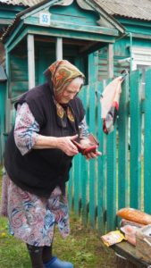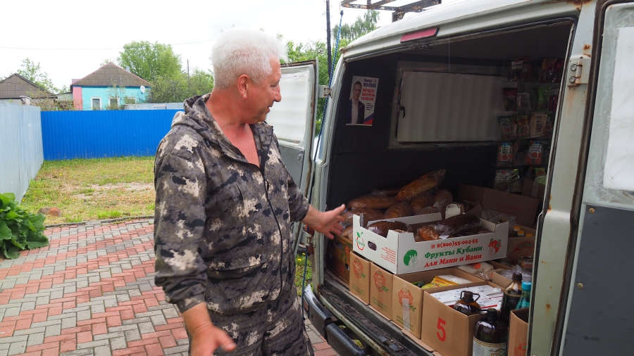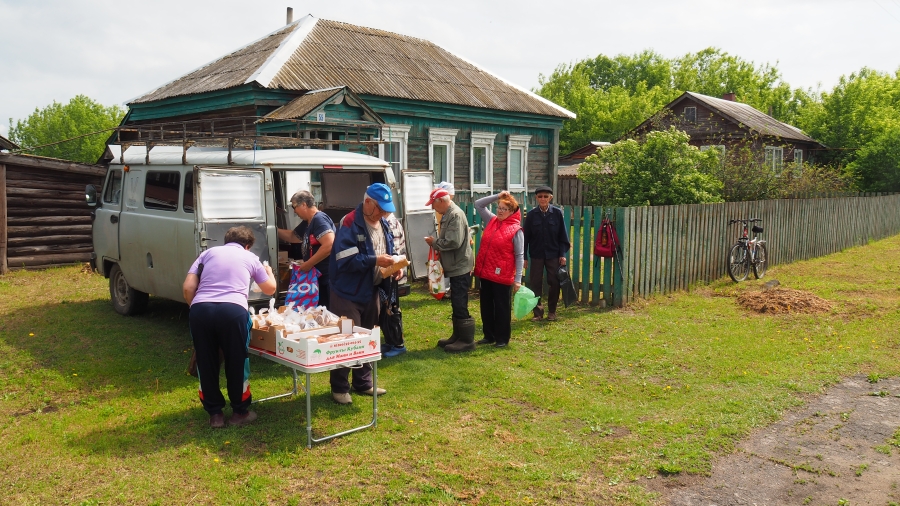 Мы уже доехали до Городца, где возле дома бабушки Маши собралось восемь человек покупателей. Это место встречи «магазина на колесах». Берут всего помаленьку. Три бананчика, пять абрикосов, мороженое, кочан капусты, сушки к чаю, квас, корм в пакетиках для кошек… Все запасаются хлебом до следующего приезда автолавки. Бабушка Мария Моисеевна, ветеран развалившегося колхоза «Пролетарский путь», покупает немного колбасы: «сама поем и кота угощу». На 20 тысяч пенсии особо не разгуляешься. Народ отоваривается степенно и быстро, «много, милок, не наберешь, ноги не ходят, руки не держат, на четыре дня должно хватить, а там Сергей наш снова приедет». Каждый покупатель уносит с собой газету «Рязанские ведомости» – наш подарок. Я даже не ожидал, что все сразу начнут ее читать, не отходя от прилавка и поставив сумки на землю. Впечатление такое, что людям приятно даже просто взять в руки печатное издание, и даже от перелистывания страниц они получают удовольствие.