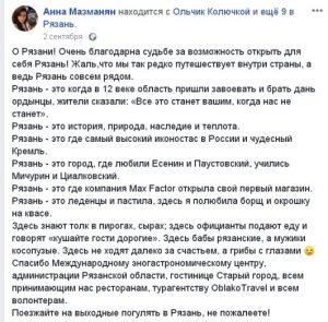 А.М. – Во время форума мы убедились, что наши города гораздо ближе, чем мы думали. У нас разное географическое положение, разная численность населения, разные культуры, но желание дружить, делиться, умение быть гостеприимными – едино. Для нас Рязань стала чем-то родным, местом, где не просто вкусно, но и очень комфортно. Мы договорились приехать друг к другу в гости, и думаю, что уже этим летом привезу сюда детей, поездим по городу и ближайшим деревням. Уверена, дети будут в восторге.