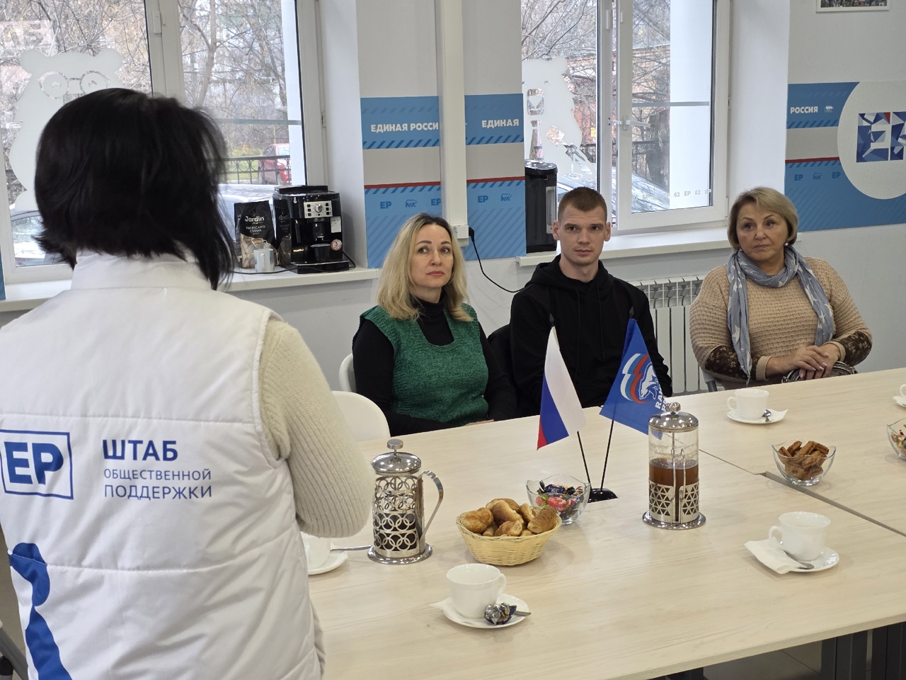 По традиции перед отправкой волонтёры собрались в Штабе общественной поддержки партии «Единая Россия», пообщались друг с другом, попили чаю и сделали фото на память с государственной символикой.