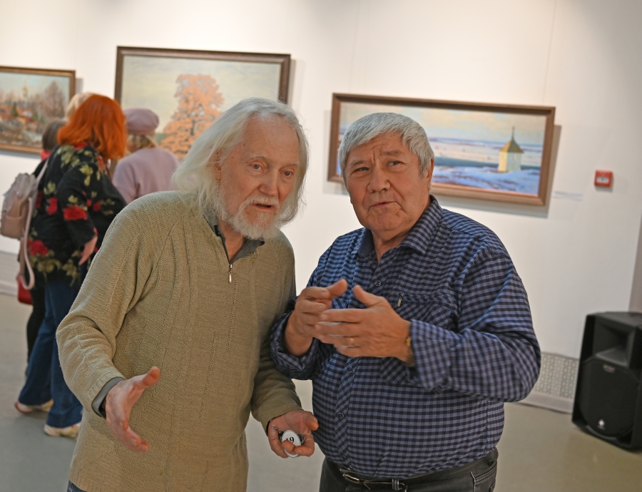 На выставке произведений рязанских художников «Осень-2023» в зале на улице Есенина представлено 165 работ ста авторов. На снимке: художники В. Чавкин и В. Курский. (6+)