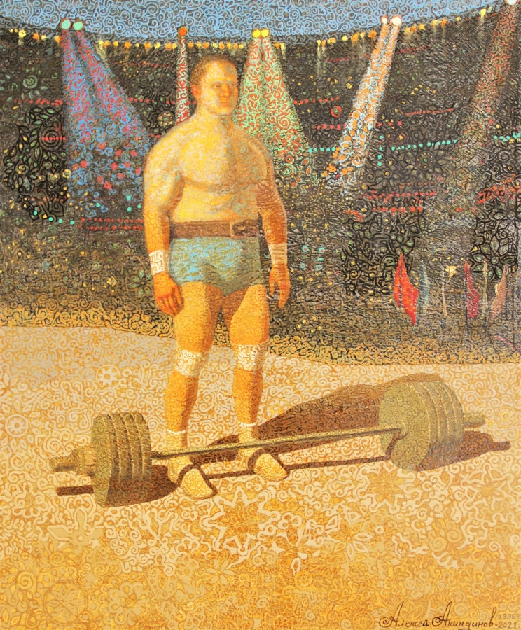 А еще эта экспозиция – о недавнем прошлом, которое не снилось даже фантастам, странном настоящем и невероятном будущем. Художники не могли не откликнуться на карантинные истории из лент новостей, с экранов и из реальной жизни. И родились самые разные по жанру работы – от «Инопланетян» Максимильяна Преснякова, где дезинфекторы кажутся обитателями Марса, до трогательных домашних зарисовок, таких как «У шторы» Елены Гончаровой. Все мы в дни самоизоляции посмотрели на близких другими глазами – и стали ценить их еще больше… И как символ несгибаемости человека на выставке представлена картина Алексея Акиндинова «Чемпион». Она посвящена недавно ушедшему из жизни Юрию Власову – советскому тяжелоатлету и олимпийскому чемпиону.