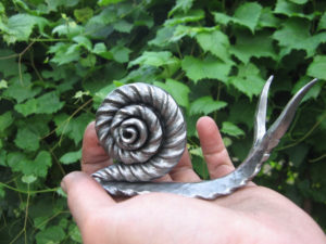Самая известная работа Дениса, которую может увидеть любой рязанец, – цветок в металлическом букете в Лесопарке. Это подарок городу от мастеров, которые участвовали в кузнечном фестивале II Международного форума древних городов в 2019 году. Денис выковал для букета анемон, который затем покрасили в фиолетовый.